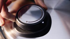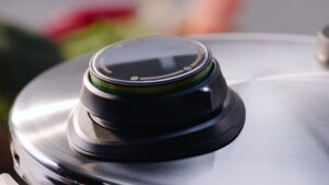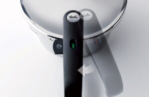 Μόλις η ένδειξη κλειδώματος γίνει πράσινη και ακουστεί το κλικ, η χύτρα ταχύτητας κουμπώνει καλά και έτσι μπορείς να ξεκινήσεις τη διαδικασία του μαγειρέματος.